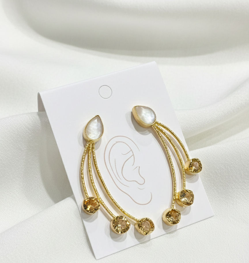 Inspired by the soft glow of first light, Aurora Trail is designed with a smooth mother-of-pearl top and fluid gold strands that fall gracefully like shimmering trails of light. Each drop moves gently with you—creating an elegant, modern silhouette with a hint of sparkle.